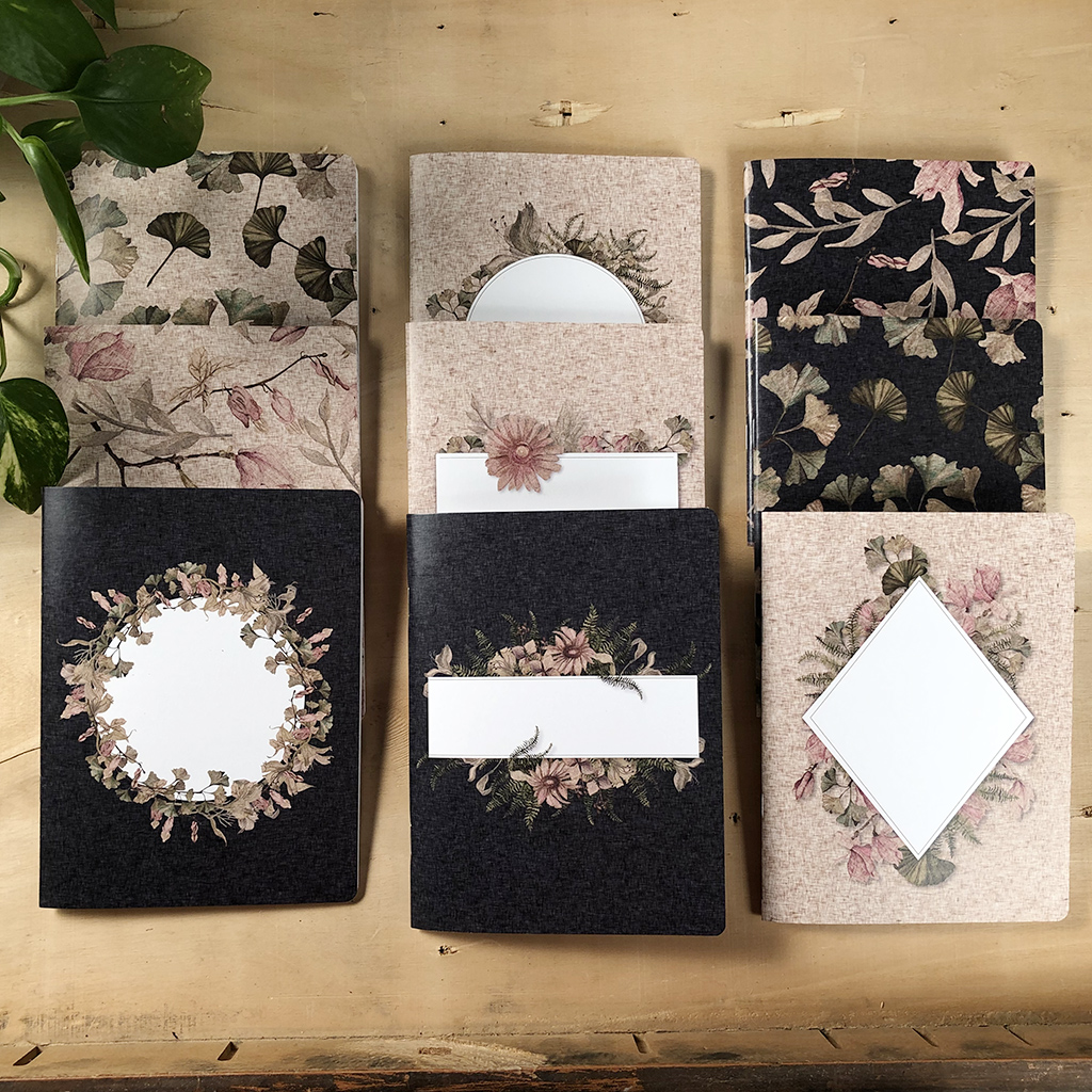Quaderni in carta naturale certificata FSC, priva di cloro e sbiancanti ottici, stampati con inchiostri atossici a biomasse. Collezione con foglie di Ginko e fiori di Magnolia, su sfondo corda e grigio antracite. Interni con punti, righe, quadri: il set di 3 pz si può scegliere con interni uguali o con uno per tipo.
