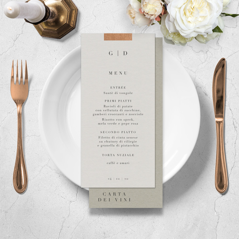 Uno stile sofisticato, una palette colori ricercata, carte tattili, lamina oro rosa.